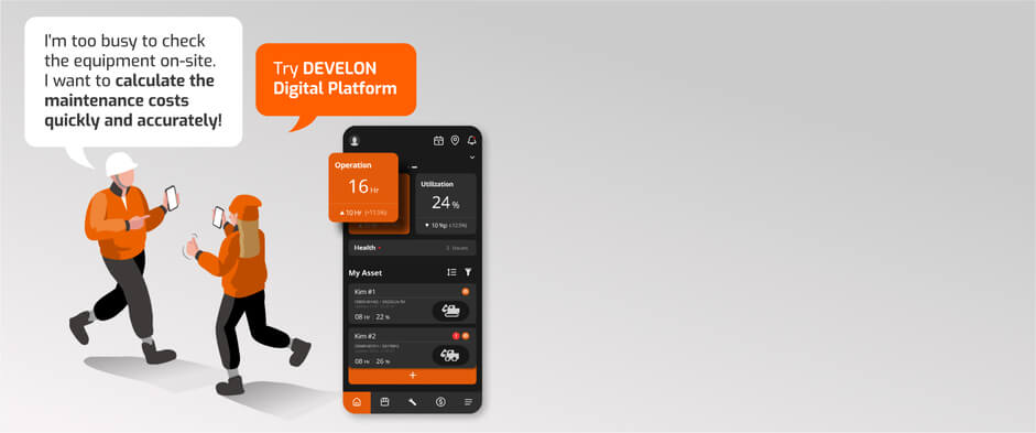 Дигиталната платформа на DEVELON ви позволява да проверявате данните за оборудването и разходите за поддръжка лесно и удобно. В допълнение, лесното за използване табло за управление осигурява бърз преглед на необходимата ви информация. Цифровата платформа на DEVELON ви спестява претърсването на дневниците, обажданията или личното посещение на обекта. Можете също така да зададете по-ефективен работен график в зависимост от напредъка на обекта.