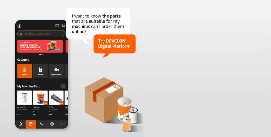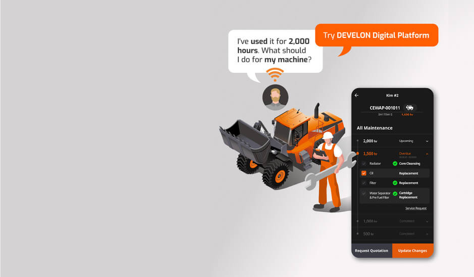 С това приложение ще получавате контролен списък с подробна информация за работните часове и уведомление за подмяна на консумативите, които трябва да бъдат подменени. Цифровата платформа DEVELON ви казва от какво се нуждаете и какво трябва да направите. Освен това, ако оборудването ви е в необичайно състояние, ще получите уведомление за повреда. Можете директно да заявите сервизно обслужване и да проверите напредъка директно в приложението.